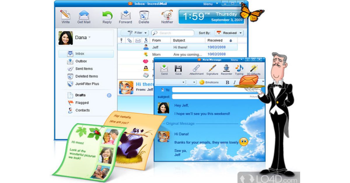 La începutul anilor 2000 mi-am cumpărat un client de e-mail adevărat, unul care să mă detașeze de concurență. Era capabil să creeze scrisori cu grafică deosebită, care să încânte destinatarul. Când primeam eu un mail, un lacheu, desen animat, se mișca pe monitor și spunea cu voce gravă: „you have mail, Sir!”