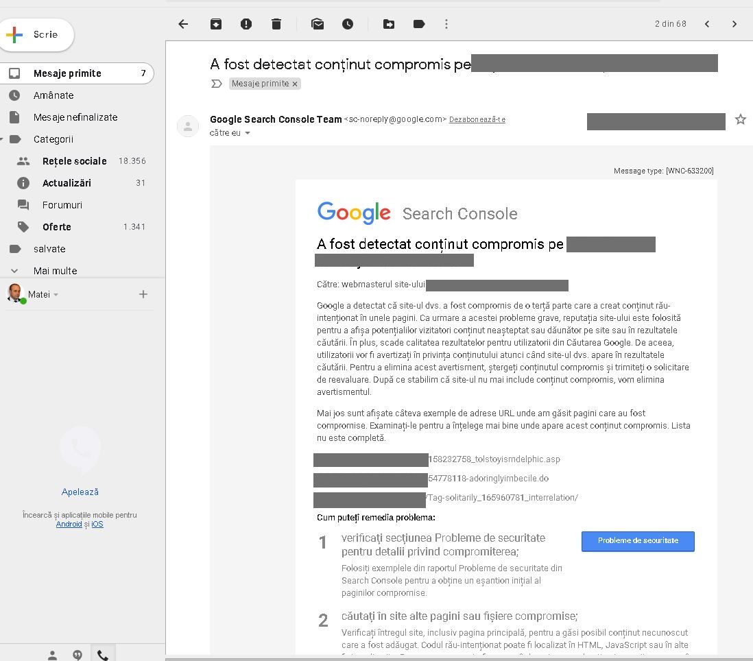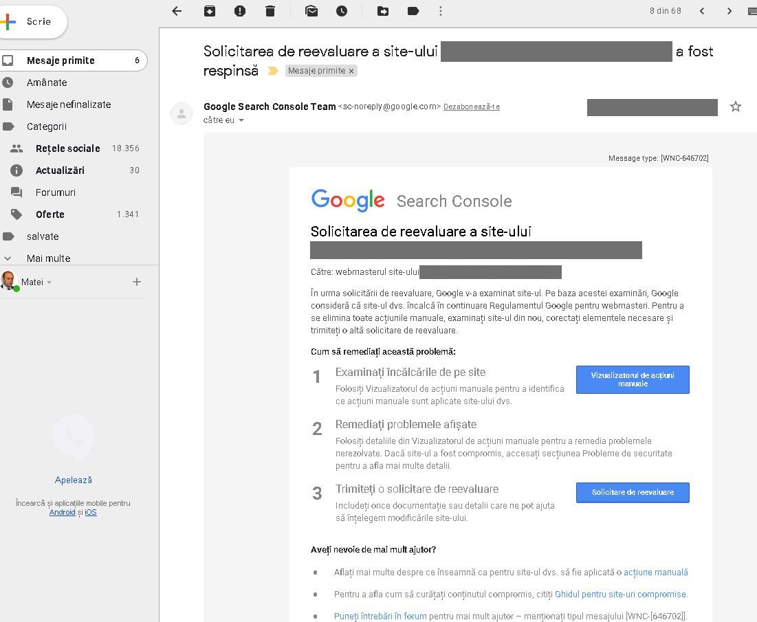Între timp cei de la Google dau site-ul în jos, adică îl găsești din ce în ce mai greu. Logic, nu corespunde criteriilor lor. Și primesc din nou mesaj de la Google, că solicitarea de revaluare a site-ului a fost respinsă. Adică nu s-a făcut ce trebuie. De asta trebuie cineva care să se uite permanent la ce se întâmplă în site. Șui să facă ce trebuie. Chiar dacă aveți senzația că este o muncă de tăiat iarba la câini.