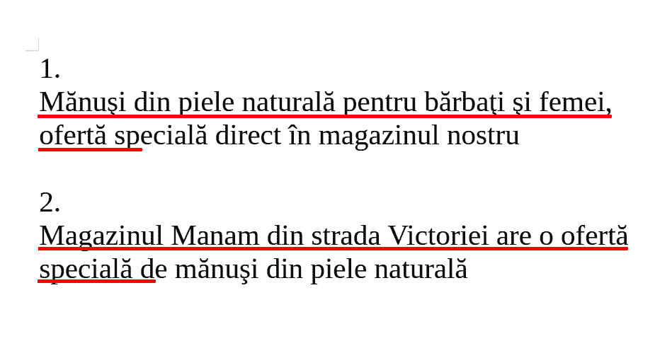 Dacă vă interesează să promovaţi „mănuşi din piele”, varianta corectă de titlu este cea cu nr 1. Motoarele de căutare (Google, Bing...) nu citesc decât un număr limitat de caractere din titlu. De regulă primele 60 de semne, respectiv caracterele subliniate cu roşu. Prin urmare, dacă aveţi cuvântul cheie dincolo de această limită, este aproape sigur că veţi fi ignoraţi.
