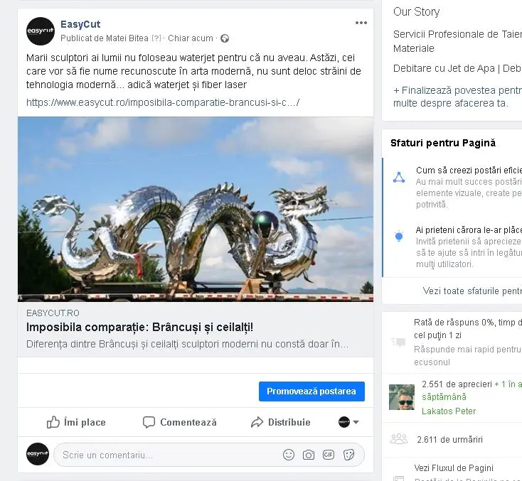 Promovare servicii de tăiere cu jet de apă pe Facebook, link-uri spre paginile site-ului