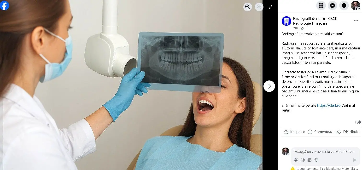 Postări pe Facebook pentru promovarea unui site şi a unor laboratoare de radiografii dentare CBCT în Timişoara