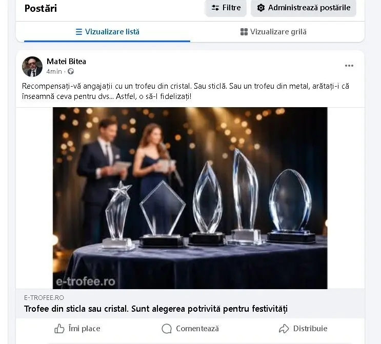 Postări pe facebook cu trimiteri la medalii, cupe, trofee. Un magazin online care induce ideea de recompensă pentru salariati.