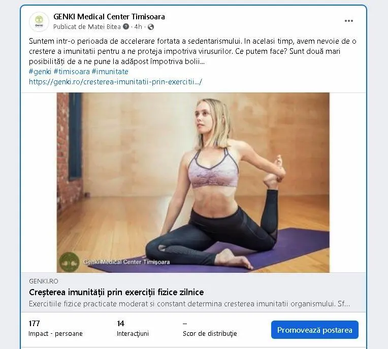 Difuzare pe Facebook a cliicii Genki a unor postări care promovează servicii medicale-recuperare si fizioterapie in Timisoara